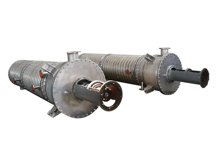 刮板薄膜蒸发器是壳体外部装有加热蒸汽夹套,其内部装有可旋转的刮板,刮板由圆筒中心的旋转轴带动。原料液由蒸发器上部沿切向加入后,在重力和旋转刮板的带动下,沿壳体的内壁面形成下旋的薄膜,完成液由底部排出器外,二次蒸汽则经除沫器后由上部排出。这种蒸发器的突出优点是对物料的适应性很强,对高黏度、易结晶、易结垢、含悬浮物或兼有热敏性料液的蒸发均适用。